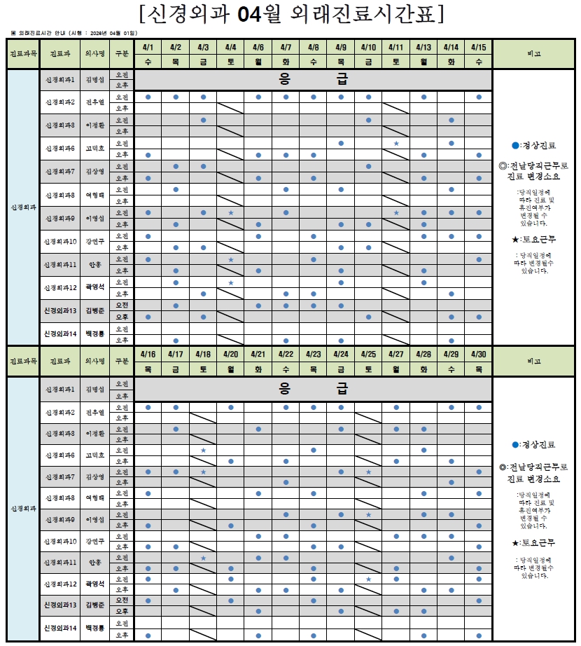 | 신경외과1 | 김명섭 | 오전 | 응급 | 응급 | 응급 | 응급 | 응급 | 응급 |
